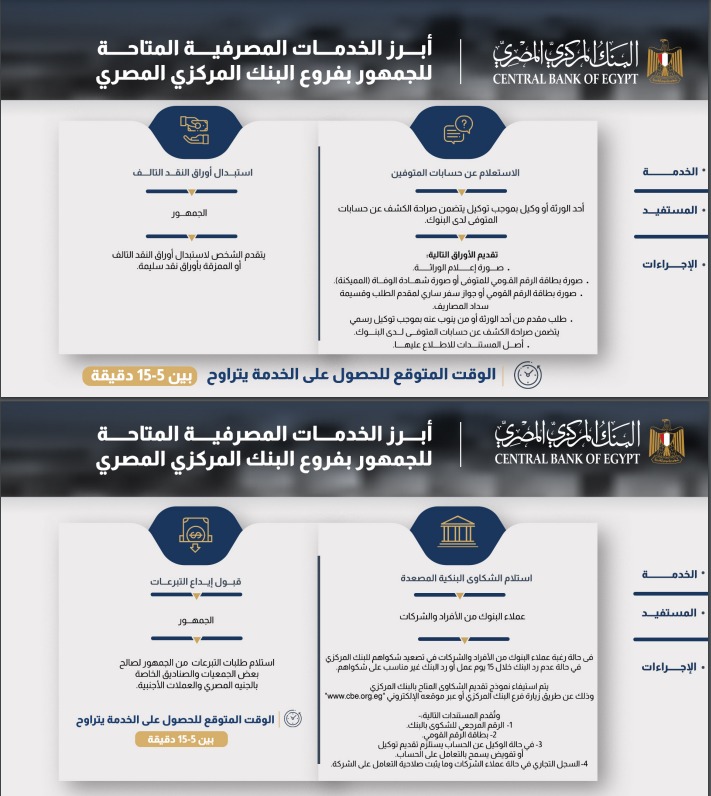 الرئيسية » البنك المركزي المصري يعلن إتاحة خدمات «الاستعلام عن حسابات المتوفين» و «استبدال العملات التالفة» و«تلقي التبرعات» و « استلام الشكاوي» عبر فروعه