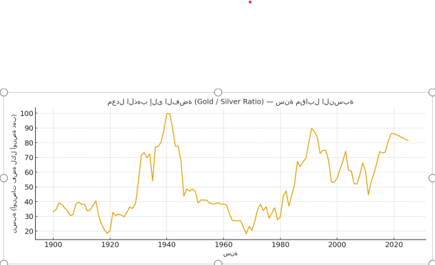 يُقاس توازن المعدنين عبر مؤشر النسبة (كم أونصة فضة تساوي أونصة ذهب واحدة). كما الشكل التالي يوضح تطور النسبة تاريخيًا (سنة مقابل النسبة) من 1900 حتى 2020، مع إشارة إلى مستوى 2025.
