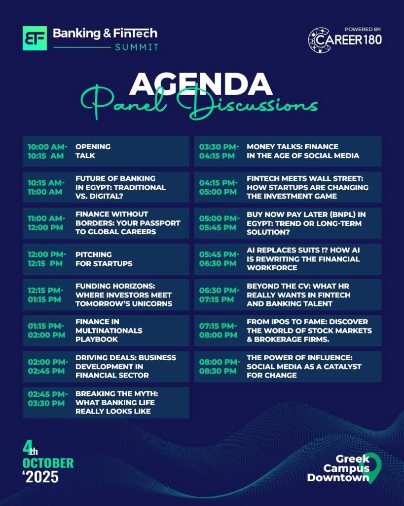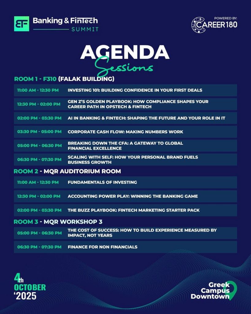 تضم القمة جلسات متوازية في ثلاثة قاعات متخصصة، منها «Investing 101: Building Confidence in Your First Deals»، و«Gen Z’s Golden Playbook: How Compliance Shapes Your Career Path»، و«AI in Banking & FinTech: Shaping the Future and Your Role in It».