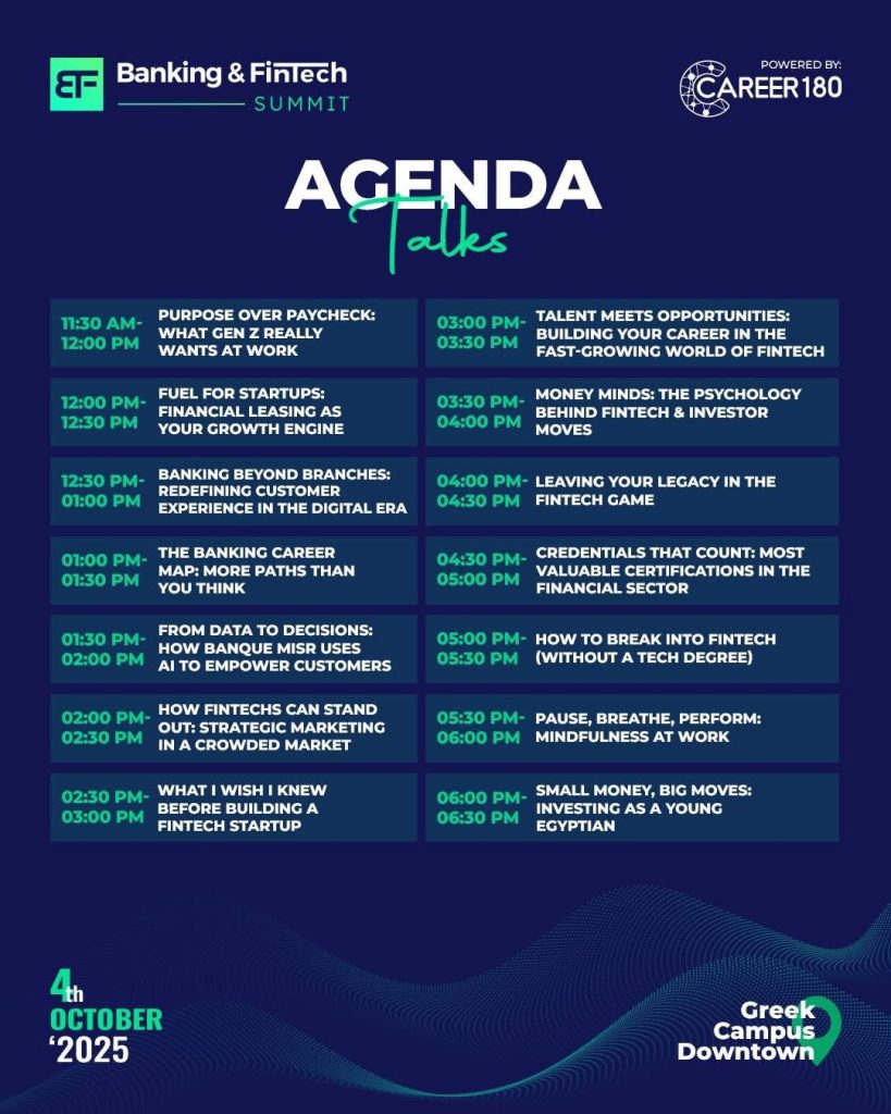 تتضمن أجندة Talks كلمات رئيسية قصيرة تغطي قضايا ملهمة، منها «Purpose Over Paycheck: What Gen Z Really Wants at Work»، و«Fuel for Startups: Financial Leasing as Your Growth Engine»، و«How Banque Misr Uses AI to Empower Customers».