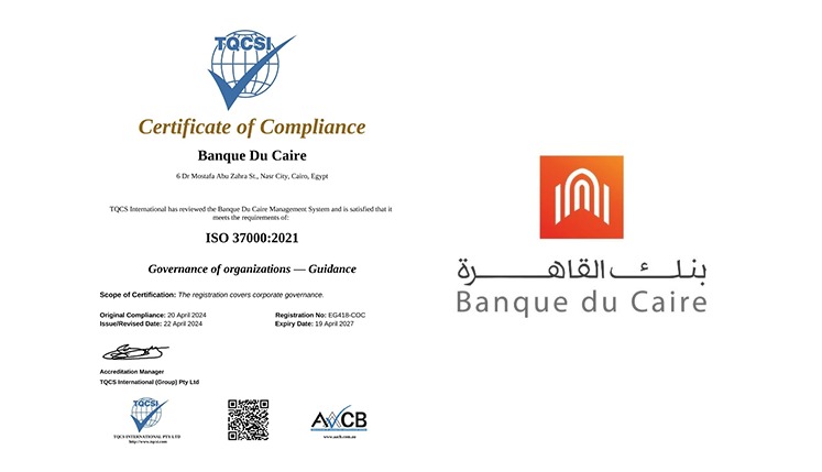 أعلن «بنك القاهرة» تمديد اعتماد شهادة الأيزو في مجال الحوكمة المؤسسية ISO 37000 للعام الثاني على التوالي. يأتي هذا تتويجاً لجهود البنك المستمرة في مواءمة أنظمته وإجراءاته مع المعايير الدولية المعتمدة.