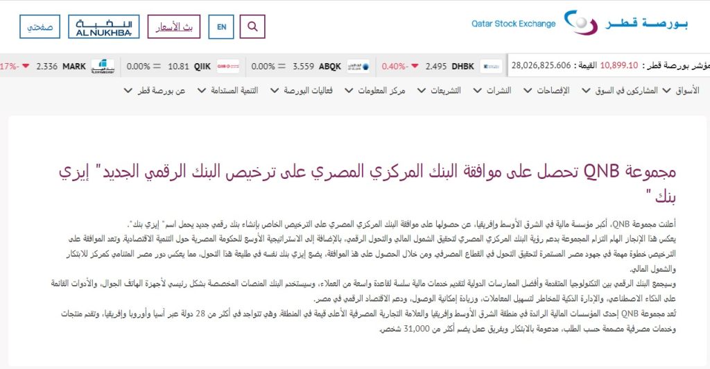 أعلنت مجموعة «QNB»، أكبر مؤسسة مالية في الشرق الأوسط وإفريقيا، عن حصولها على موافقة البنك المركزي المصري على الترخيص الخاص بإنشاء بنك رقمي جديد يحمل اسم «إيزي بنك» ،برأسمال مصدر قدره 2 مليار جنيه، وبنسبة مساهمة تبلغ 99.9% مملوكة لبنك قطر الوطني الأهلي وشركته التابعة التمويل والسلامة ش.ذ.م.م.