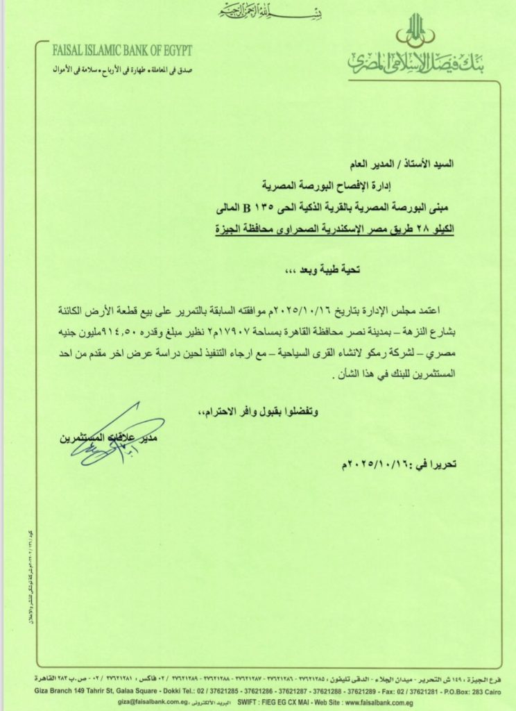 وافق مجلس إدارة بنك فيصل الإسلامي المصري على بيع قطعة الأرض الكائنة بشارع النزهة بمدينة نصر بمحافظة القاهرة، والبالغ مساحتها 170907 متر مربع، بقيمة إجمالية قدرها 914.5 مليون جنيه.