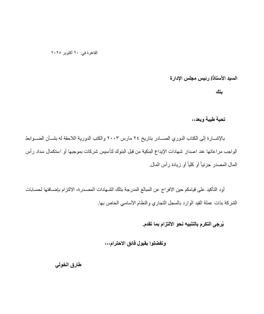وجاء في الكتاب الدوري الموجه إلى البنوك، والمستند إلى تعليمات سابقة صدرت في 24 مارس 2003، التأكيد على ضرورة التزام البنوك بإضافة المبالغ المدرجة في شهادات الإيداع إلى حسابات الشركات بذات عملة القيد الوارد في السجل التجاري والنظام الأساسي للشركة.