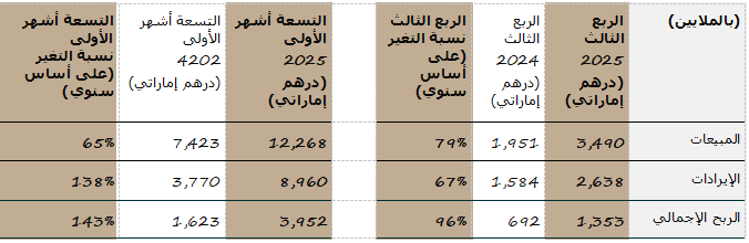 وخلال الربع الثالث من عام 2025، بلغت الإيرادات 2.64 مليار درهم بارتفاع نسبته 67% على أساس سنوي، بينما قفز صافي الربح بنسبة 101% ليصل إلى 839 مليون درهم مقارنةً بـ 417 مليون درهم في الربع الثالث من عام 2024.