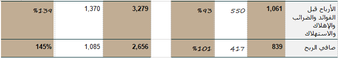 • زيادة الربح الإجمالي بنسبة 143% ليصل إلى 3.95 مليار درهم، وارتفاع الأرباح قبل الفوائد والضرائب والإهلاك والاستهلاك بنسبة139 % لتبلغ 3.28 مليار درهم.