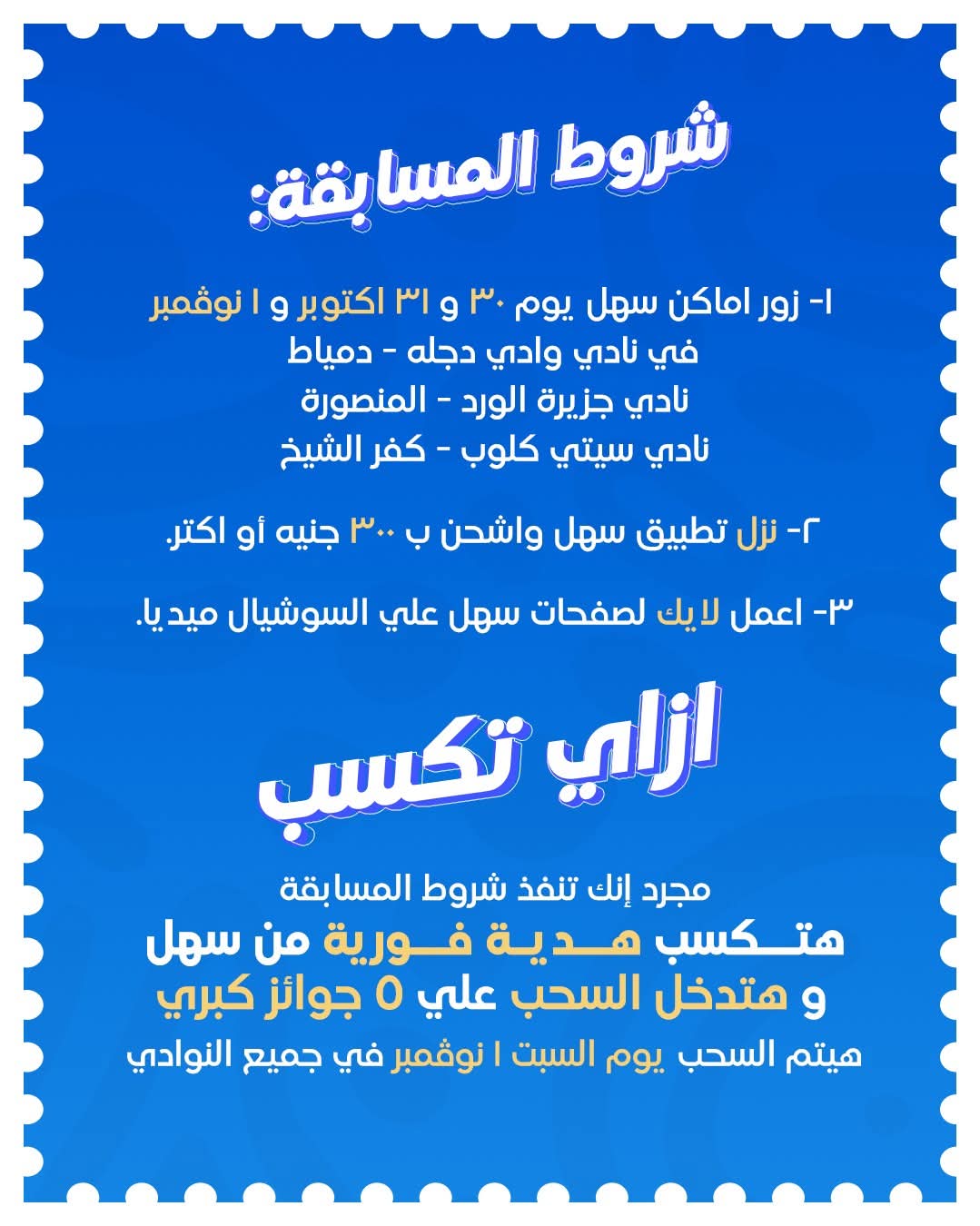 - بعد استيفاء الشروط، يحصل المشارك على هدية فورية ويدخل السحب على خمس جوائز كبرى تُعلن يوم 1 نوفمبر في جميع الأندية المشاركة.