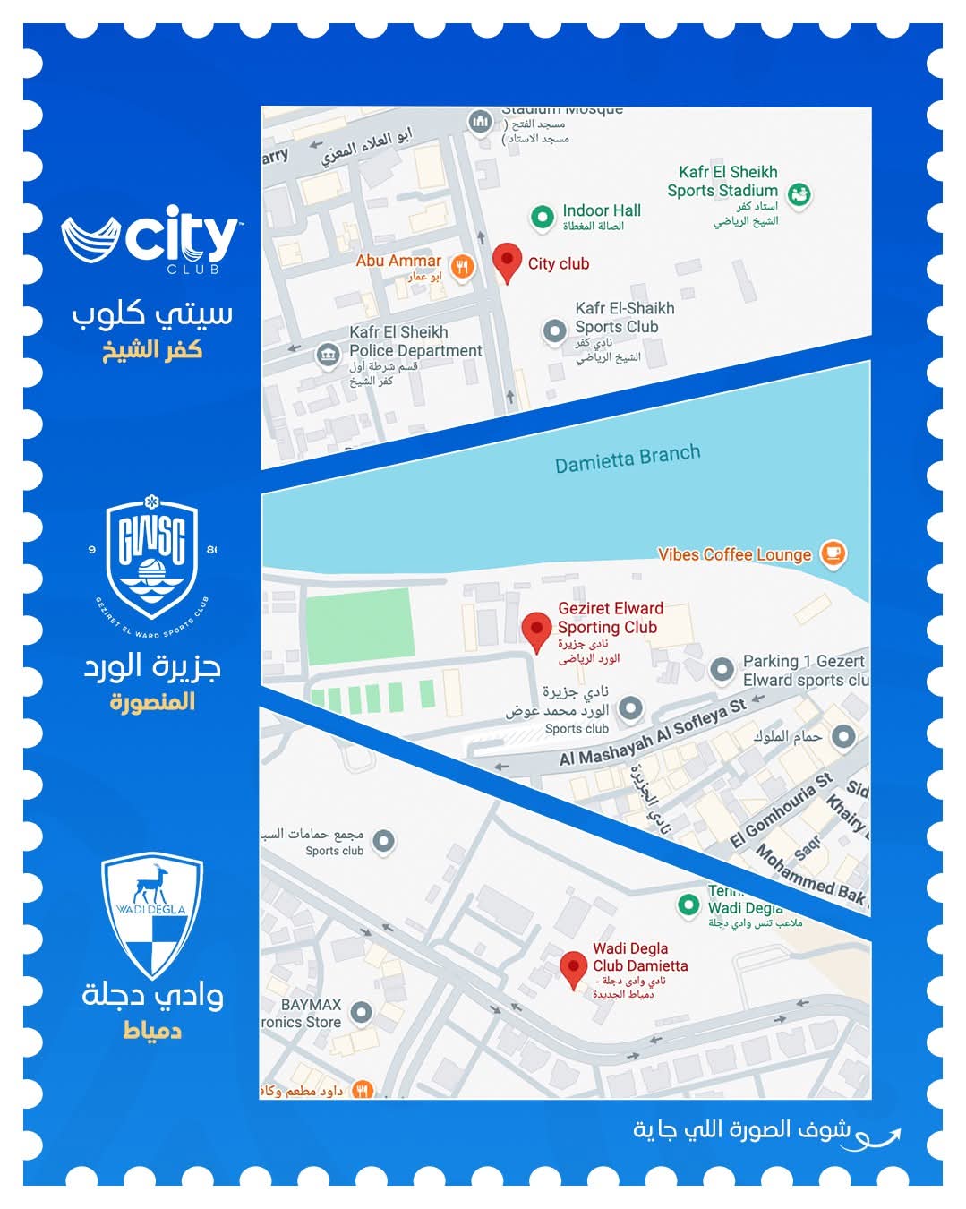 تُقام فعاليات الحملة في نادي وادي دجلة – دمياط، ونادي جزيرة الورد – المنصورة، ونادي سيتي كلوب – كفر الشيخ.