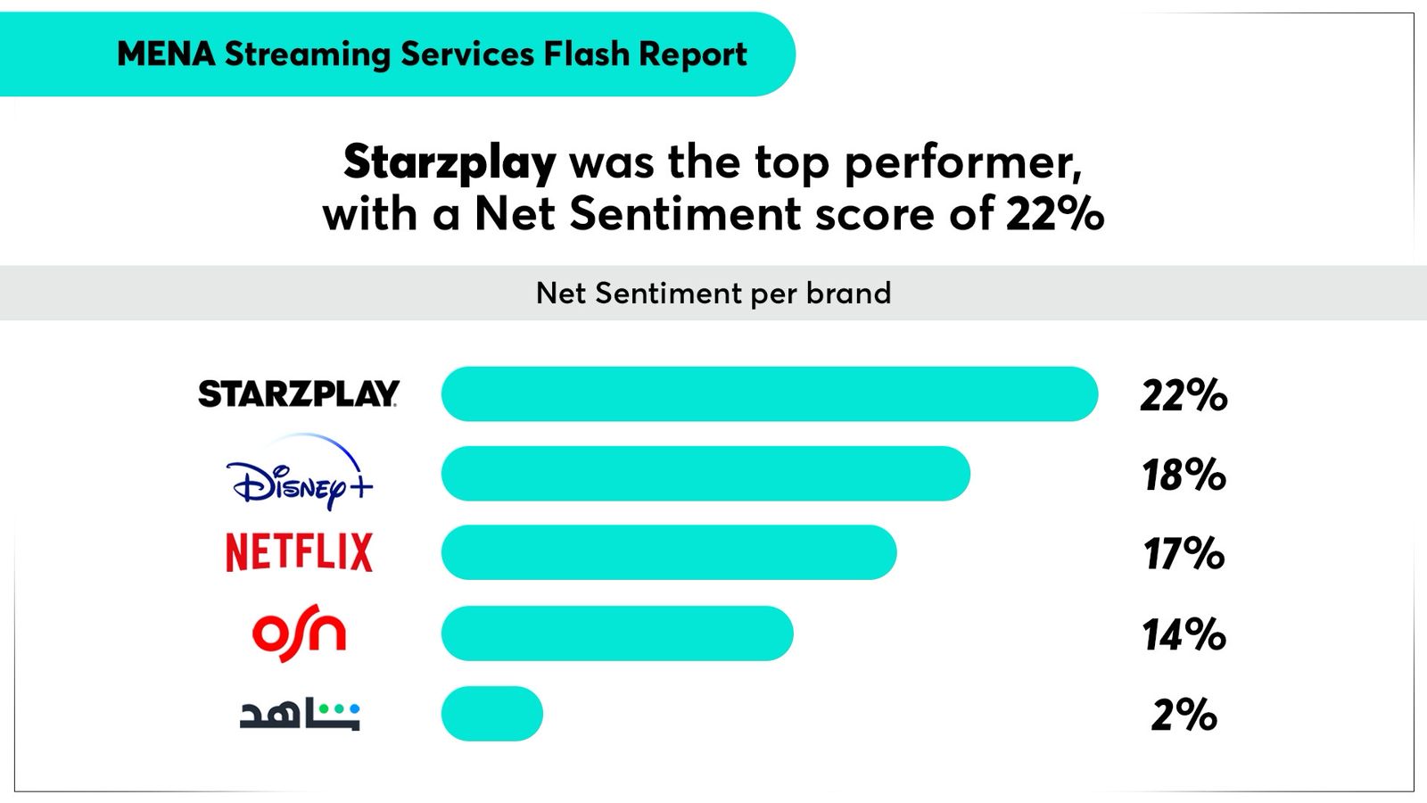 ووفقًا للتقرير، الذي رصد أكثر من 109 آلاف محادثة عامة في 17 دولة ضمن المنطقة. تميّزت «ستارزبلاي» بتحقيق أعلى نسبة تفاعل إيجابي بلغت +22%، متقدمةً بذلك على كبرى منصات البث العالمية والإقليمية.