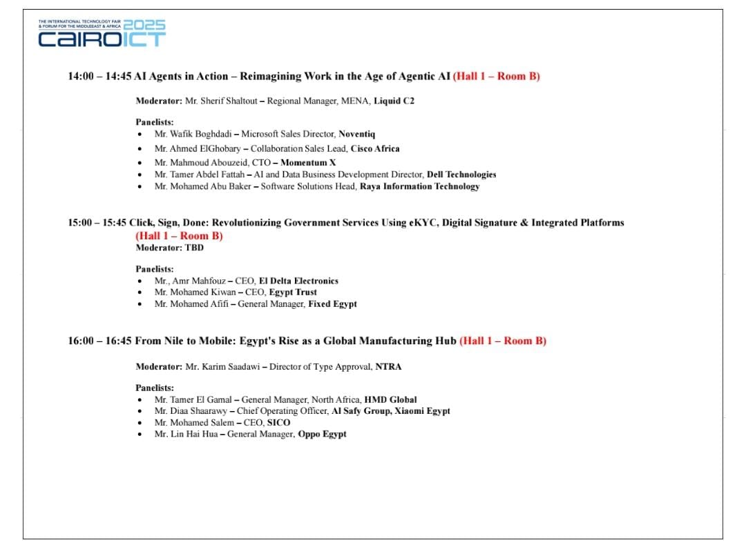 ويواصل Cairo ICT دوره كمنصة رئيسية لبناء الشراكات واستعراض الابتكارات واستكشاف التقنيات التي تشكل مستقبل التكنولوجيا في مصر والمنطقة.