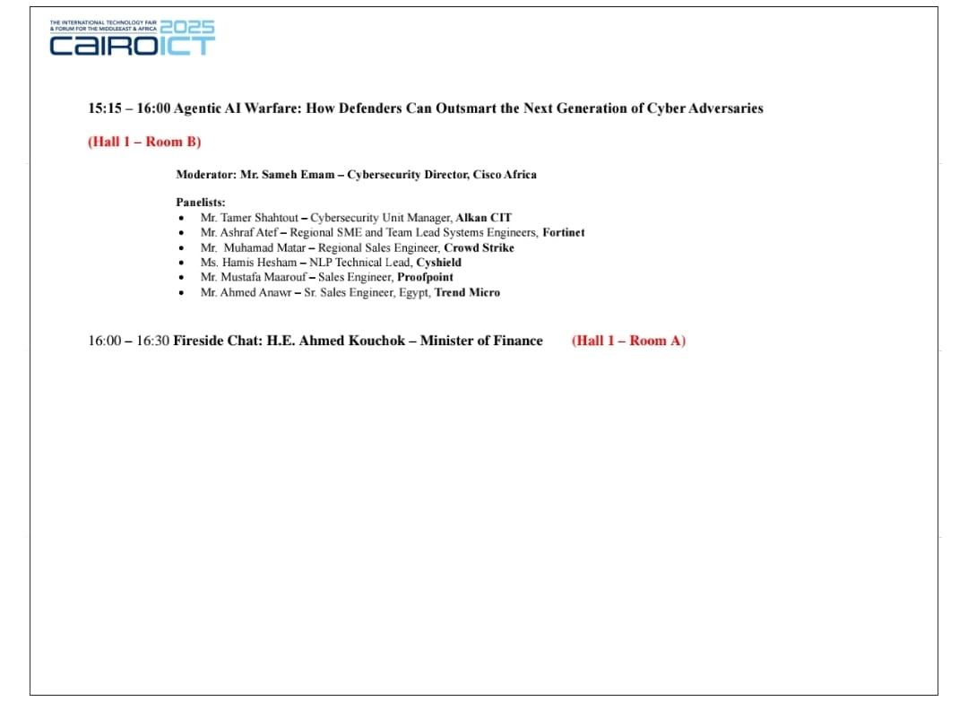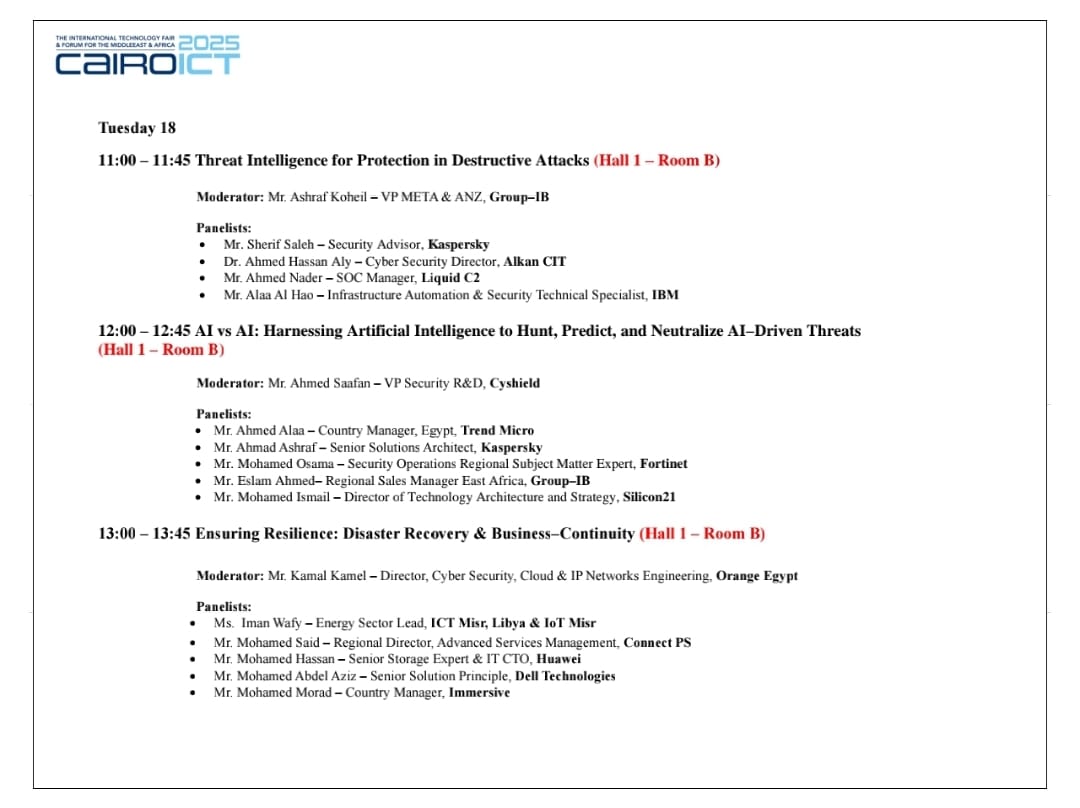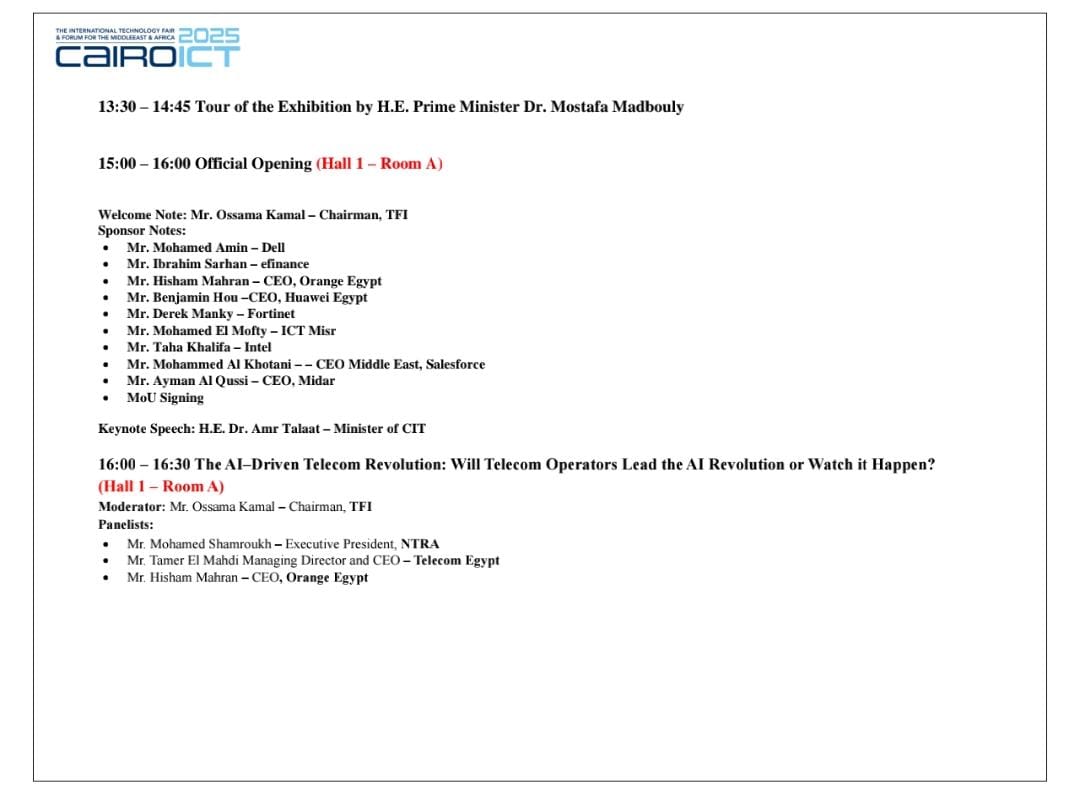 ويواصل Cairo ICT دوره كمنصة رئيسية لبناء الشراكات واستعراض الابتكارات واستكشاف التقنيات التي تشكل مستقبل التكنولوجيا في مصر والمنطقة.