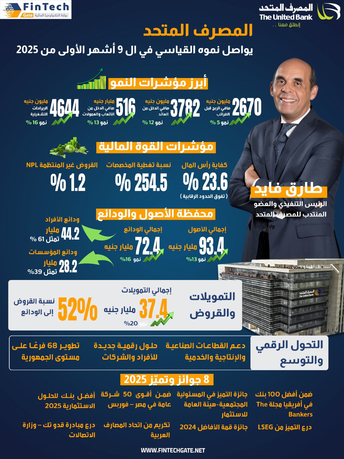كما ارتفع إجمالي رصيد تمويلات العملاء بنحو 6.2 مليار جنيه لتصل إلى 37.4 مليار جنيه خلال التسعة اشهر الاولى من عام 2025 مقارنة بـ 31.2 مليار جنيه بنهاية عام 2024 بمعدل نمو بلغ 20%. وهذا يعكس مدي حرص المصرف المتحد على تعزيز وتنمية محفظته الائتمانية وملائتها علي مستوي قطاعات الاعمال المختلفة. تمويل الشركات الكبرى والتمويلات المشتركة كذا تمويل المشروعات الصغيرة والمتوسطة والمتناهية الصغر. بالإضافة إلى محفظة التجزئة المصرفية. حيث بلغت نسبة إجمالي القروض إلى الودائع نحو 52% خلال التسعة اشهر الاولى من عام 2025.