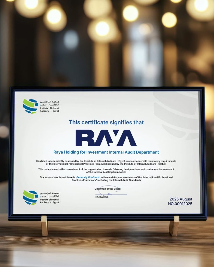 «راية القابضة» تحصل على شهادة التوافق مع المعايير الدولية للمراجعة الداخلية من الجمعية المصرية للمراجعين الداخليين