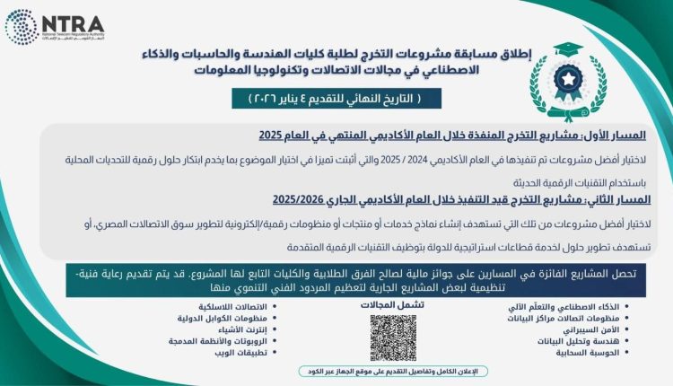 أعلن الجهاز القومي لتنظيم الاتصالات عن إطلاق مسابقة لمشروعات التخرج لطلبة كليات الهندسة والحاسبات والذكاء الاصطناعي، في مجالات الاتصالات وتكنولوجيا المعلومات،