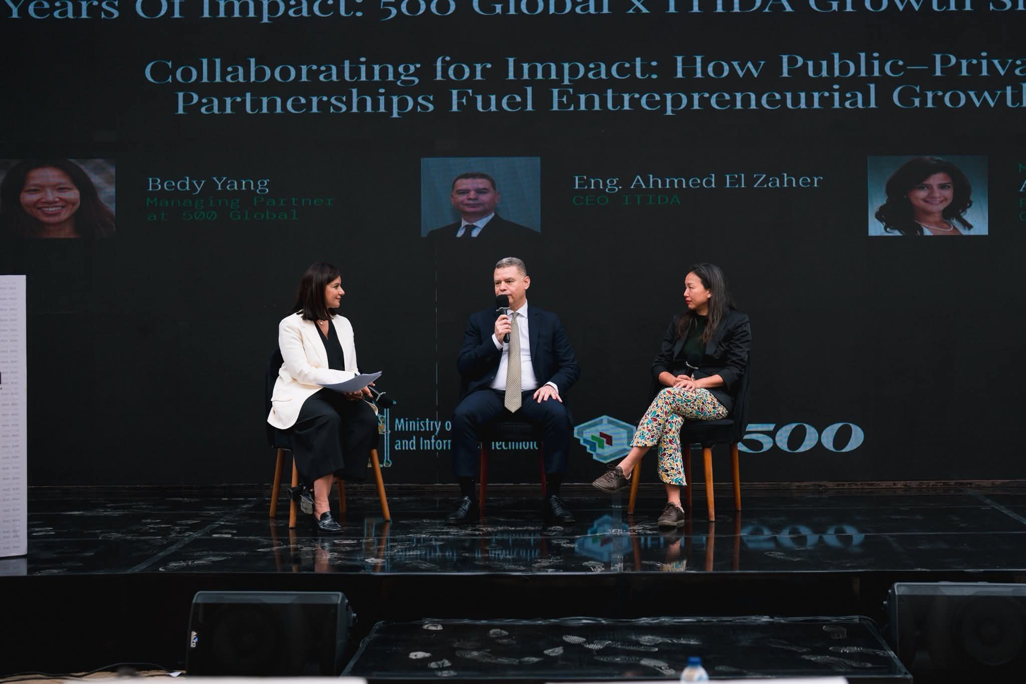 وتضمنت الفعالية جلسة نقاشية شارك فيها كل من المهندس أحمد الظاهر، الرئيس التنفيذي لهيئة تنمية صناعة تكنولوجيا المعلومات (ITIDA)، والسيدة بيدي يانغ، الشريك الإداري في 500 Global، والسيدة أمل عنان، الشريك في 500 Global، حيث ناقش المشاركون أثر الشراكة في تمكين رواد الأعمال، وبناء القدرات. كما تعزيز تنافسية الشركات الناشئة المصرية على المستويين الإقليمي والدولي.