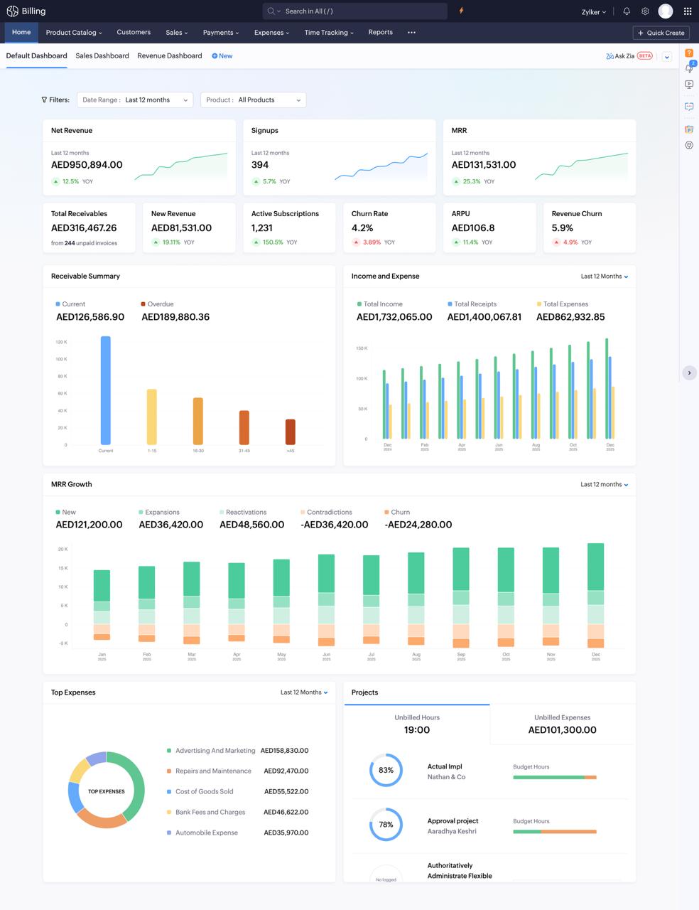 يفضل العملاء في المشهد الراهن ممارسة الأعمال مع التجار الذين يوفرون المرونة في السداد استنادًا إلى استخدامهم الفعلي. وفي ظل استخدام الشركات لأدوات تقليدية محدودة المرونة. كما يصبح من الصعوبة بمكان التعامل مع التسعير غير القابل للتنبؤ وعقود التمويل. وهو ما يجعل تحديد الإيرادات في نهاية الأمر أكثر تعقيدًا وقابلية للخطأ. ويساعد «إصدار زوهو لفوترة المشروعات» الشركات على اكتساب مرونة عالية لتوليد الدخل من خلال أي استراتيجية عصرية لتحقيق الإيرادات. كما إلى جانب قابلية التوسع للتعامل مع المدفوعات من أي حجم وسيناريوهات الفوترة الأكثر تعقيدًا.