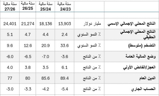 تحسن وضع القطاع الخارجي مع انتعاش الأنشطة المولّدة للنقد الأجنبي مثل السياحة واستقرار تدفقات رؤوس الأموال. كما يدعم هذا التحسن استمرار قوة تحويلات العاملين بالخارج، والتي ارتفعت بشكل ملحوظ بعد خفض قيمة العملة. ومن المتوقع أن ينخفض عجز الحساب الجاري من -4.2% من الناتج المحلي الإجمالي في السنة المالية 2024/2025 إلى نحو -3% في السنة المالية 2026/2027.