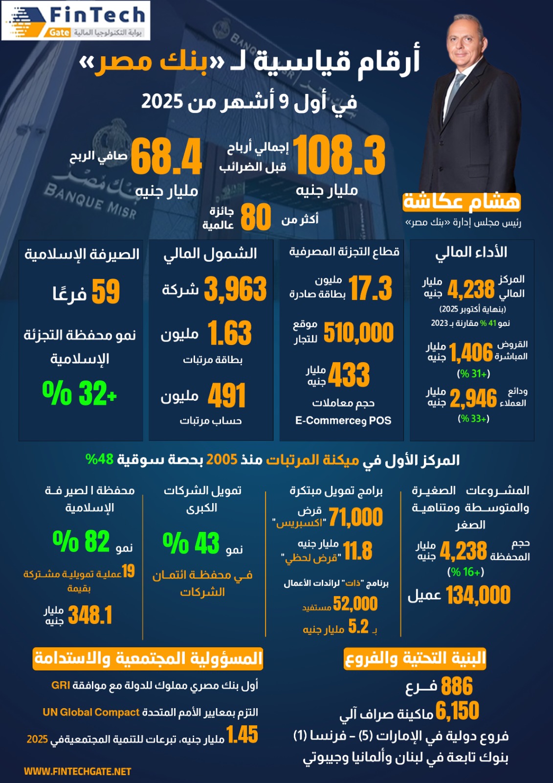 حقق بنك مصر أداءً ماليًا قويًا ونموًا ملحوظًا في مختلف قطاعات أعماله خلال عام 2025، بما يعكس متانة مركزه المالي وقدرته على تحقيق نتائج مستدامة. وبلغ إجمالي أرباح البنك قبل الضرائب 108.3 مليار جنيه مصري، متضمنة 39.9 مليار جنيه ضرائب، ليحقق صافي ربح قدره 68.4 مليار جنيه عن الفترة المالية المنتهية في 30 سبتمبر 2025.
