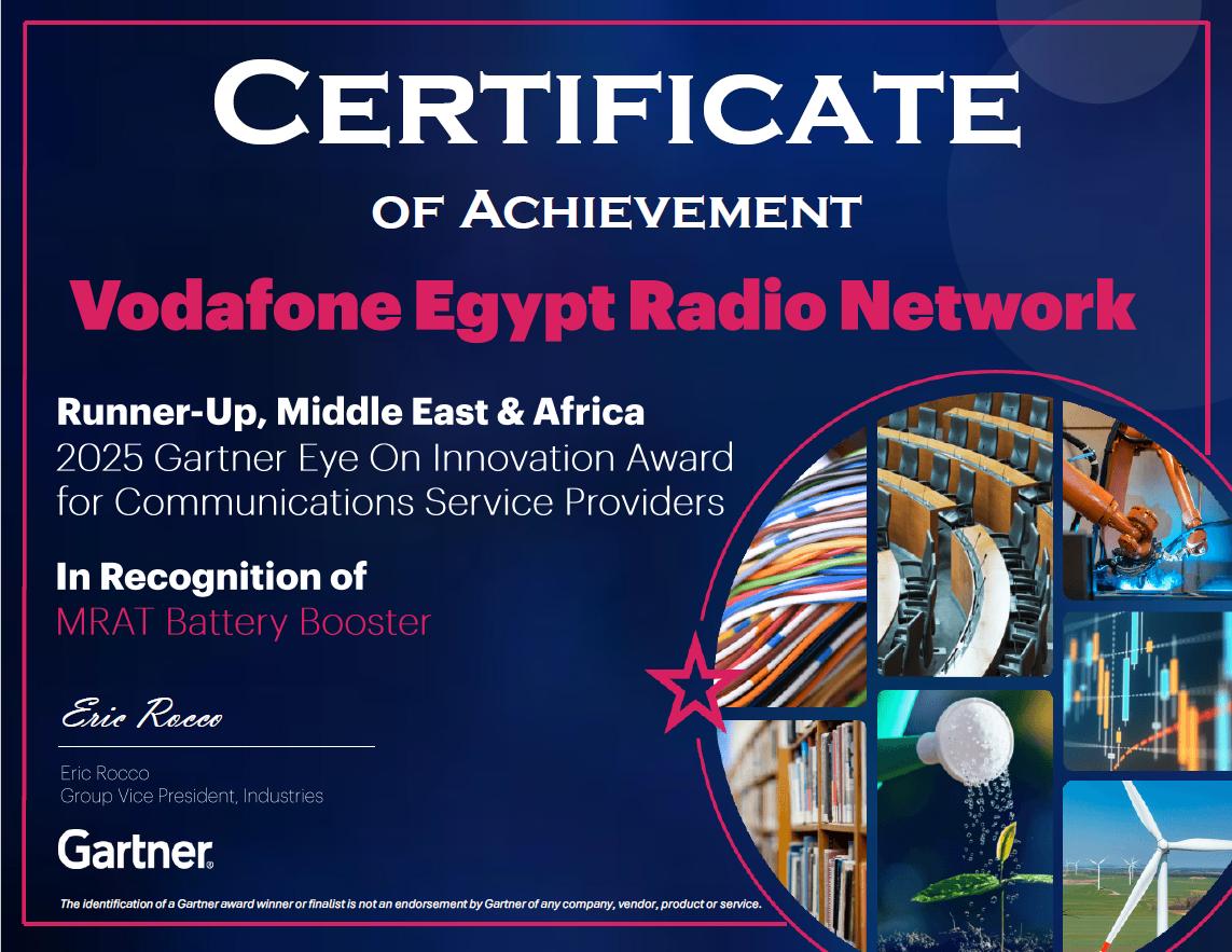 تسلط جوائز Gartner Eye on Innovation الضوء على شركات الاتصالات التي تحقق ابتكارات تقنية لها أثر تشغيلي ملموس. ويؤكد هذا التكريم ريادة ڤودافون مصر في الابتكارات الخاصة بتعزيز مرونة الشبكات والاتصالات التي تتمتع بجاهزيتها للمستقبل، كما يُبرز هذا الحل أيضًا التأثير المباشر للتكنولوجيا المملوكة للشركة على موثوقية واستمرارية الخدمات. من ناحية أخرى يؤكد حل «MRAT Availability Booster» مرونة البنية التحتية لشبكة ڤودافون مصر، بما يضمن لها أداءً مرتفعًا بمستوى جودة ثابت في جميع أنحاء مصر.