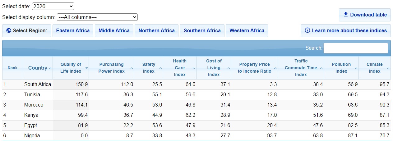 جاءت مصر ضمن أفضل خمس دول أفريقية لمؤشر جودة الحياة لعام 2026، وفق تقرير Numbeo السنوي، الذي يقيم الدول على أساس مجموعة من العوامل اليومية التي تؤثر في معيشة السكان، مثل القوة الشرائية، تكلفة المعيشة، الأمان، الرعاية الصحية، المناخ، البنية التحتية، والتنقل، إلى جانب معايير أخرى مثل جودة الخدمات العامة. التقرير استند إلى استبيانات مباشرة من السكان المحليين لتقديم صورة دقيقة عن أسلوب الحياة في الدول الأفريقية.