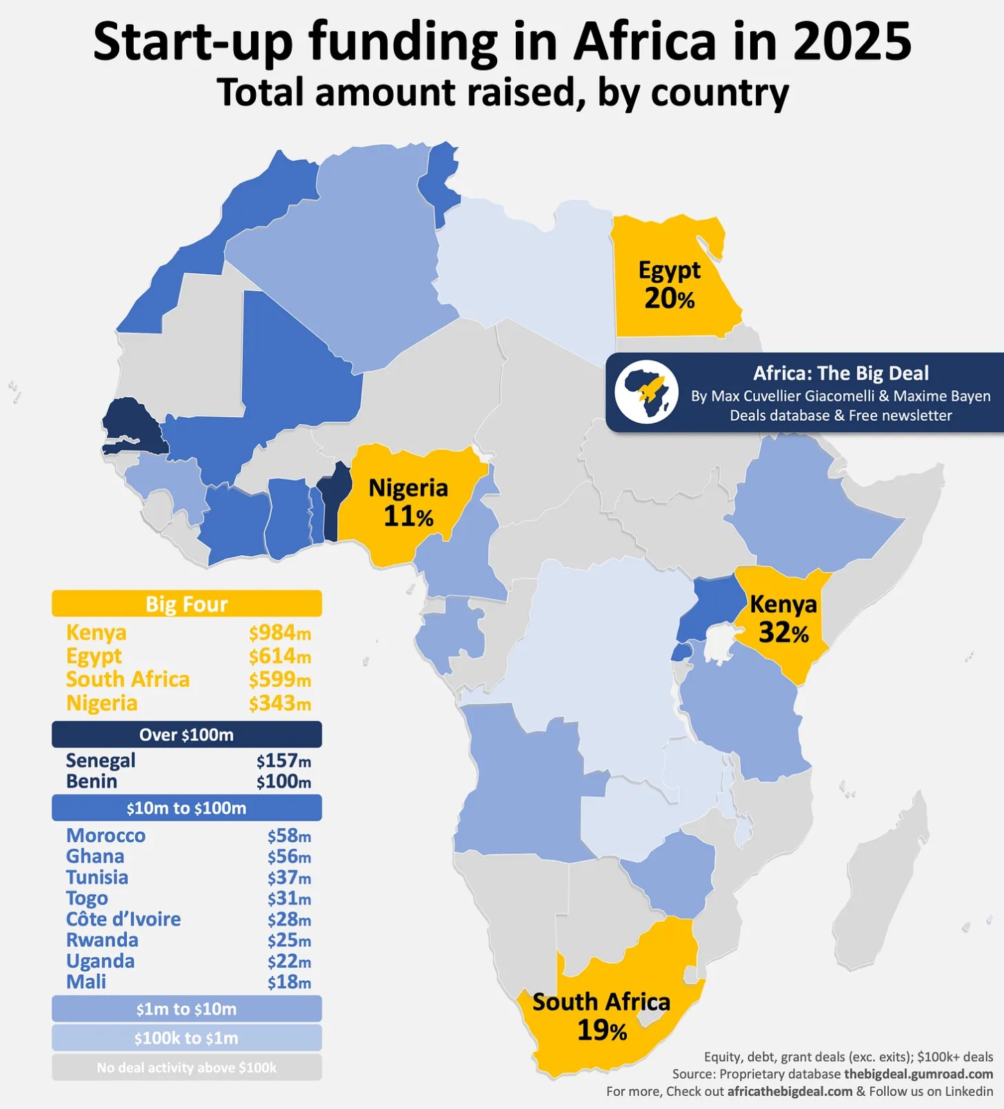 وبحسب مركز AFICA: thebigdeal فقد شهد عام 2025 استمرار هيمنة الدول الأربعة الكبرى في إفريقيا على تمويل الشركات الناشئة. مع استحواذها على 82% من إجمالي التمويل، وهو نفس الحصة التي سجلتها منذ 2019. الدول الأربعة تشمل مصر وكينيا ونيجيريا وجنوب إفريقيا. وتمثل هذه الدول حوالي 30% من سكان القارة و40% من الناتج المحلي الإجمالي الاسمي.