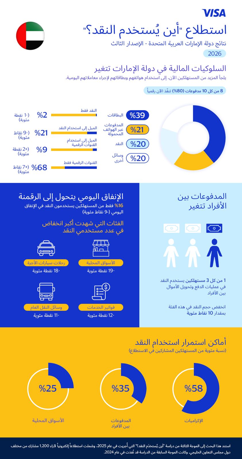 تشهد جاذبية النقد تراجعاً في المعاملات اليومية، إذ يستخدم 16% فقط من المستهلكين الذين شملهم الاستطلاع في الإمارات النقد في مشترياتهم اليومية. بانخفاض عن 25% في العام السابق. ويظهر هذا التراجع عبر جميع الفئات الرئيسية التي لا يزال النقد شائعاً فيها. مثل الأسواق المحلية (-19%)، ورحلات سيارات الأجرة (-18%)، ودفع الفواتير (-12%).