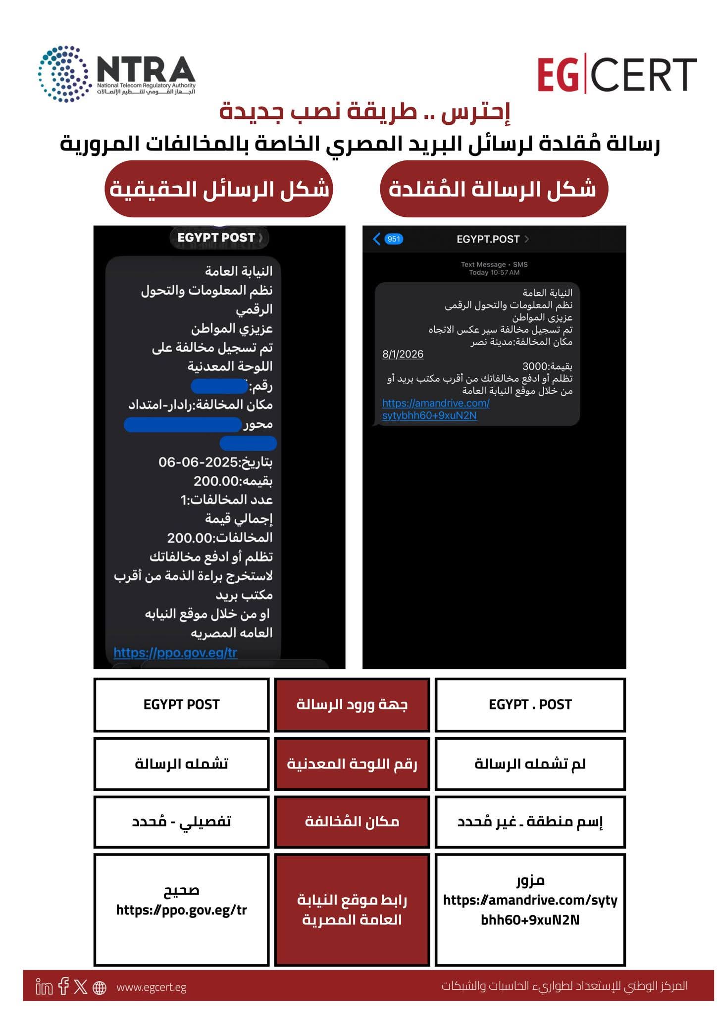 حذّر الجهاز القومي لتنظيم الاتصالات، ممثلًا في المركز الوطني للاستعداد لطوارئ الحاسبات والشبكات (EG-CERT)، من أسلوب احتيالي جديد يعتمد على إرسال رسائل نصية مزيفة تنتحل صفة البريد المصري بزعم تسجيل مخالفات مرورية على المواطنين.