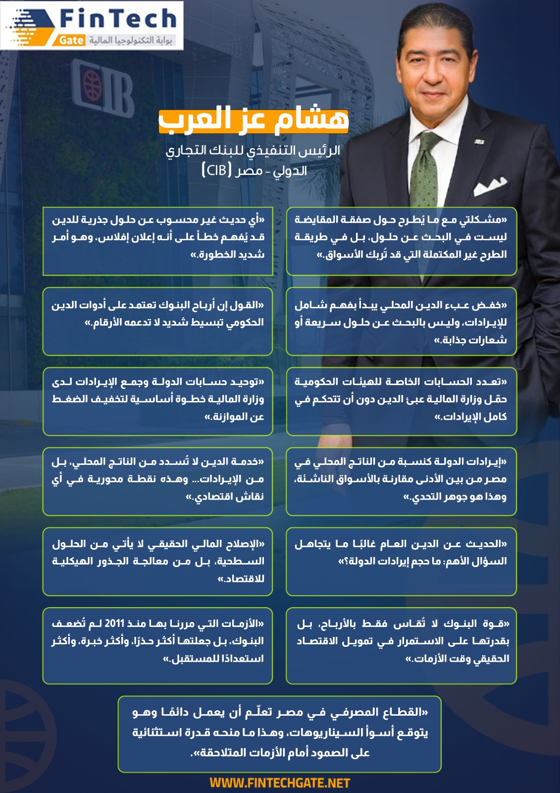 رؤية «هشام عز العرب» الرئيس التنفيذي لـ «CIB» بشأن ملف الديون إنفوجراف بواسطة FinTech Gate في يناير 21, 2026 شارك فينتك جيت: خاص رؤية «هشام عز العرب» الرئيس التنفيذي لـ «CIB» بشأن ملف الديون في هذا السياق، ومن ناحية أخرى، هناك العديد من الأخبار المرتبطة بالقطاع والتي يمكنك متابعتها: «هشام عز العرب»: التجارب الصعبة عززت صلابة القطاع المصرفي المصري والإصلاح المالي يبدأ بتعظيم الإيرادات لا بالحلول السطحية «هشام عز العرب» يكتب: تحصين البنوك خط الدفاع الأول لاستقرار الاقتصادات CIBالاقتصادالبنوكالرؤيةالرئيس التنفيذيالقطاع المصرفيملف الديونهشام عز العرب شارك