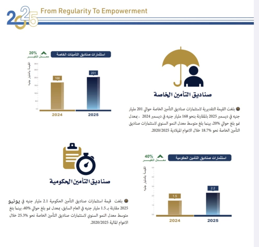 وفي السياق ذاته، أشارت الهيئة إلى أن استثمارات صناديق التأمين الحكومية ارتفعت إلى نحو 2.2 مليار جنيه بنهاية 2025. مقارنة بنحو 1.5 مليار جنيه في العام السابق. محققة معدل نمو بلغ 40%، بما يؤكد توسع دور هذه الصناديق في دعم منظومة الحماية التأمينية.