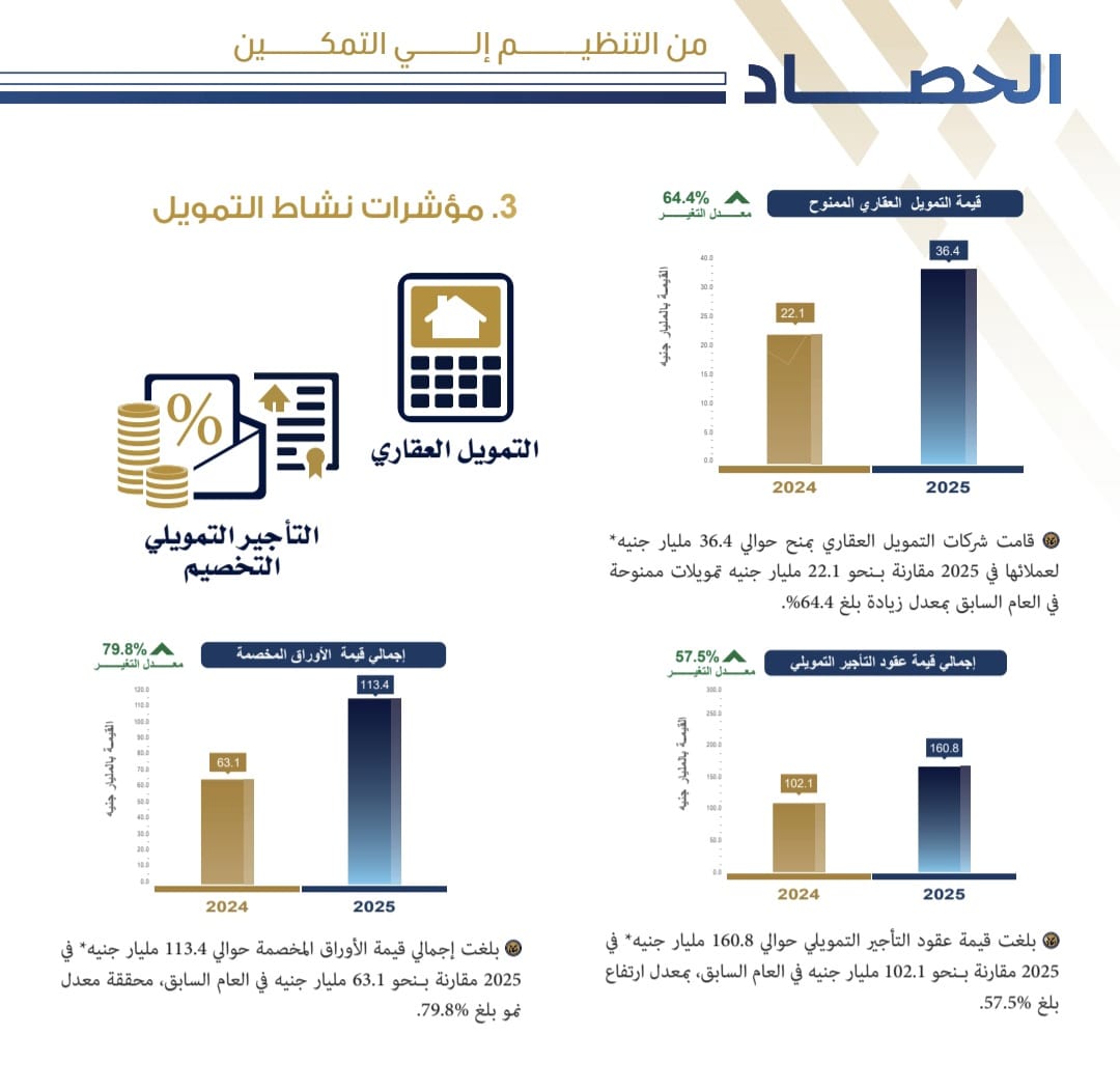 وأشارت الهيئة إلى أن إجمالي قيمة عقود التأجير التمويلي سجل نحو 160.8 مليار جنيه خلال 2025. مقابل 102.1 مليار جنيه خلال 2024، محققًا معدل نمو سنوي بلغ 57.5%.