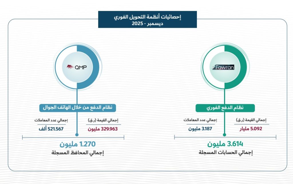 وفيما يتعلق بالتحويلات الفورية، أظهرت بيانات ديسمبر تسجيل 3.614 ملايين حساب ضمن نظام التحويل الفوري «فورا». بقيمة إجمالية بلغت 5.092 مليارات ريال قطري (ما يعادل نحو 1.37 مليار دولار أميركي)، وحجم معاملات وصل إلى 3.187 مليون عملية.