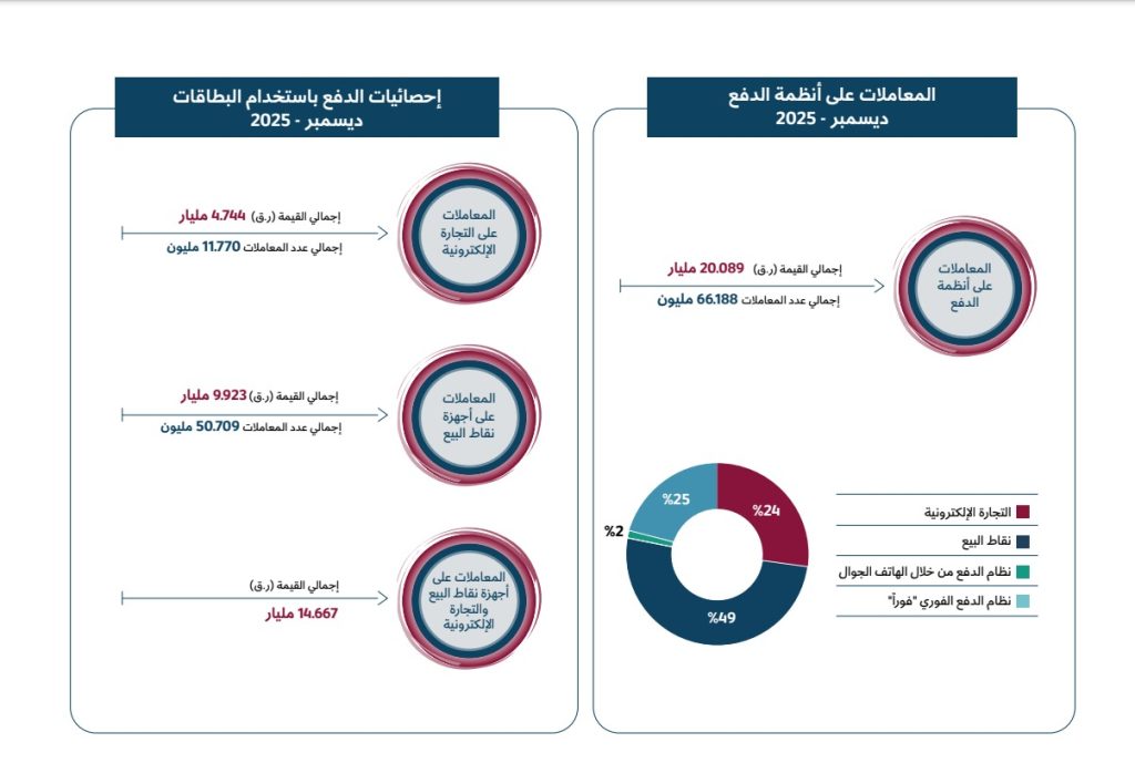 سجلت قطر معاملات عبر أنظمة الدفع المختلفة بقيمة إجمالية بلغت 20.089 مليار ريال قطري (ما يعادل نحو 5.42 مليارات دولار أميركي) خلال ديسمبر 2025، مع وصول عدد المعاملات إلى 66.188 مليون معاملة، وفق بيانات رسمية لـ«مصرف قطر المركزي».