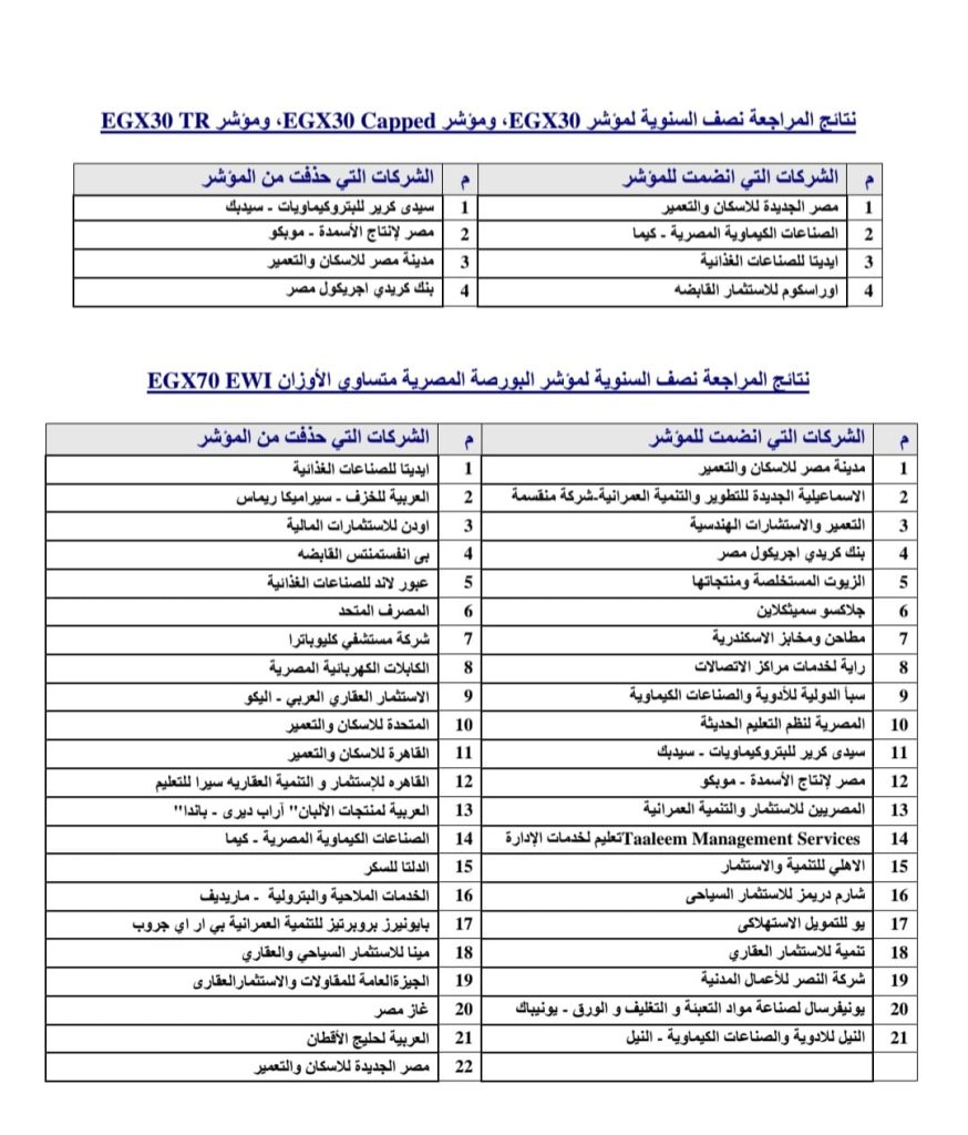 وفيما يتعلق بمؤشر EGX33 للشريعة، الذي يضم الشركات الأكثر توافقًا مع أحكام الشريعة الإسلامية من بين الشركات الأكثر سيولة. فقد أسفرت المراجعة عن حذف وانضمام 4 شركات.