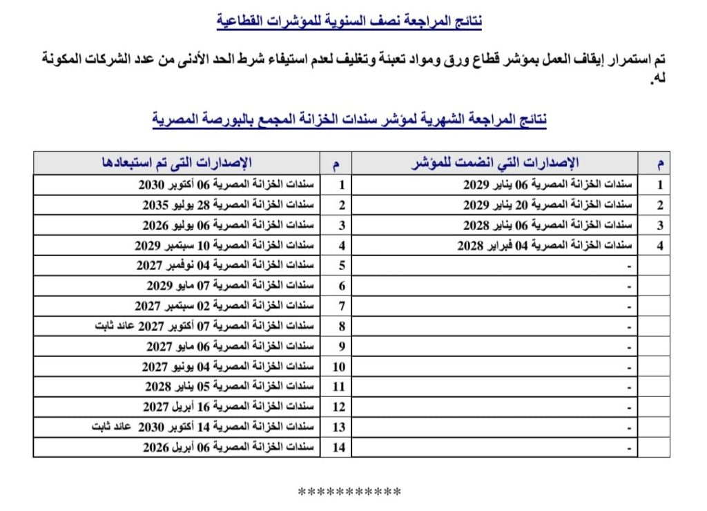 وعلى صعيد مؤشرات سندات الخزانة، أشارت البورصة المصرية إلى أنه خلال فترة المراجعة الشهرية تم انضمام 4 إصدارات جديدة وخروج 14 إصدارًا، ليصل إجمالي عدد السندات المدرجة بالمؤشر إلى 18 إصدارًا. لافتة إلى أن مراجعة مؤشرات سندات الخزانة تتم بصفة شهرية وفقًا لمعايير الانضمام والاستبعاد المعتمدة بمنهجية مؤشرات السندات.