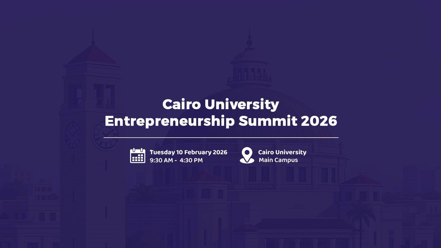 أعلنت جامعة القاهرة برئاسة الأستاذ الدكتور محمد سامي عبد الصادق عن فتح باب التسجيل للمشاركة في النسخة الثانية من قمة ريادة الأعمال بجامعة القاهرة، والمقرر انعقادها يوم 10 فبراير بالحرم الجامعي الرئيسي.