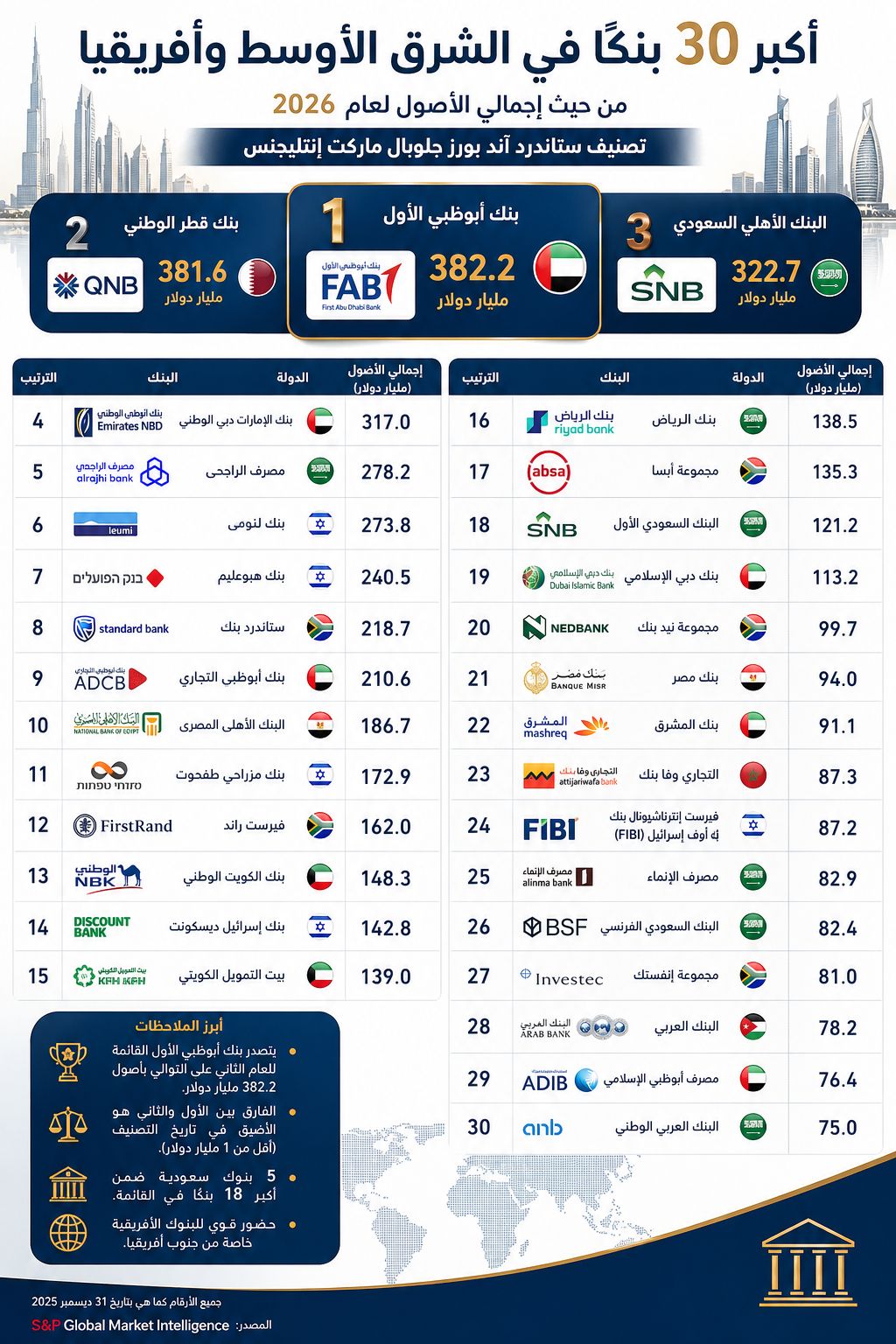 الرئيسية » أنفوغرافيك – تعرف على قائمة «ستاندرد آند بورز» لأكبر 30 بنكاً في الشرق الأوسط وأفريقيا لعام 2026